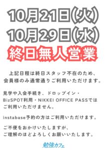 10月21日(火)・29日(水)は諸事情により無人営業いたします。