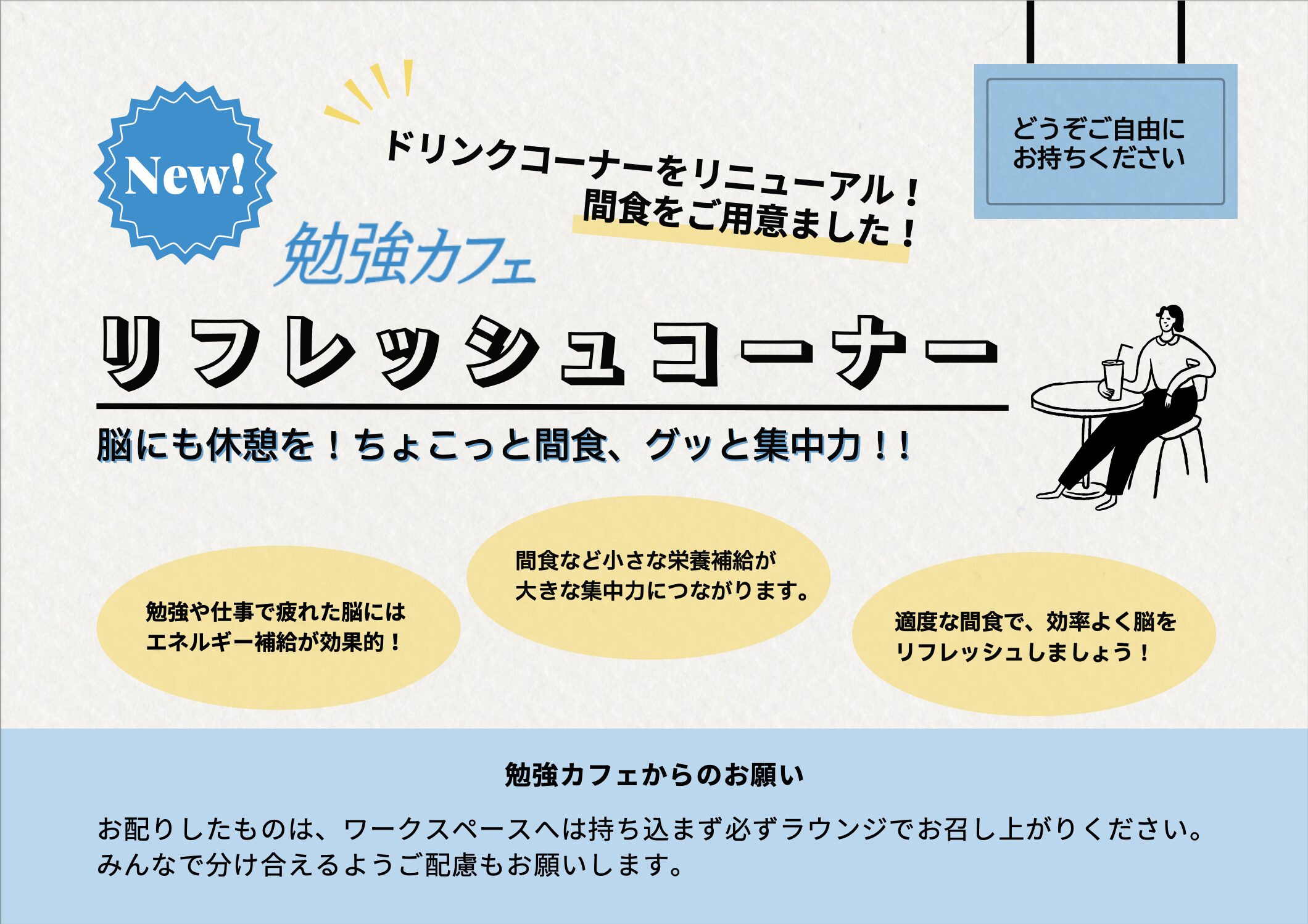 ドリンクコーナーをリニューアル!「リフレッシュコーナー」を設置し間食をご用意しました。